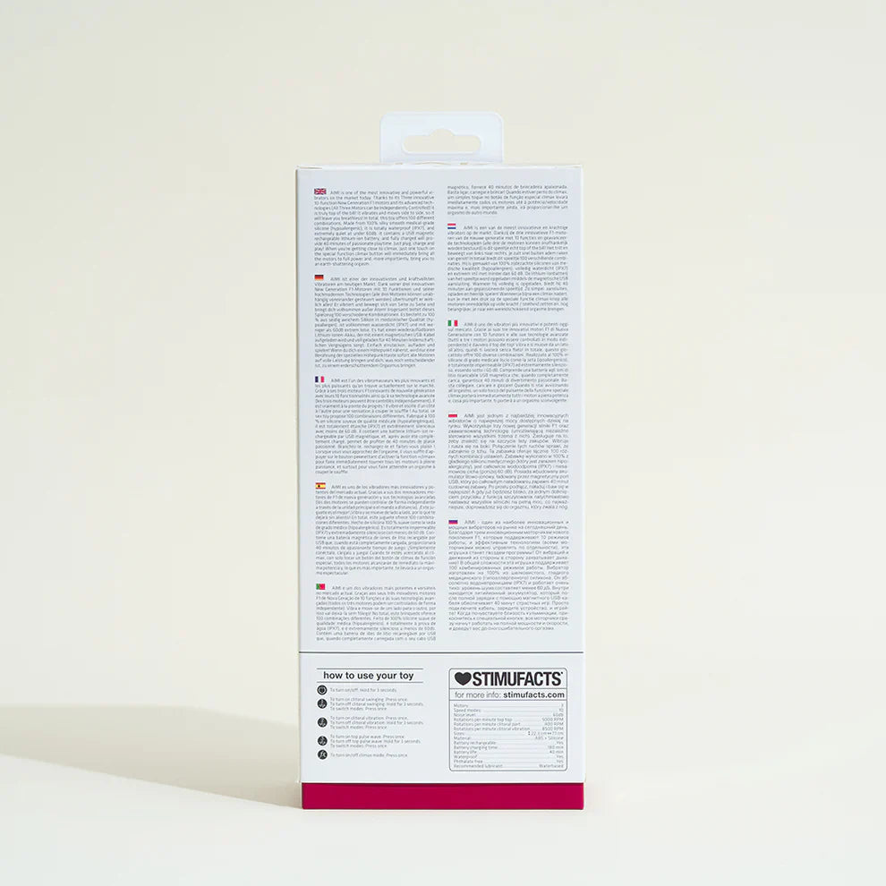 Découvre Aimi de VIVE, un rabbit nouvelle génération qui imite le toucher humain : vibrations profondes, tapotement ciblé du point G et “swing” clitoridien à micro-picots. Les 3 moteurs se pilotent séparément pour composer ta combinaison idéale… ou tout envoyer au max d’une pression avec la touche Climax. Prépare-toi à des sensations franchement enivrantes.
