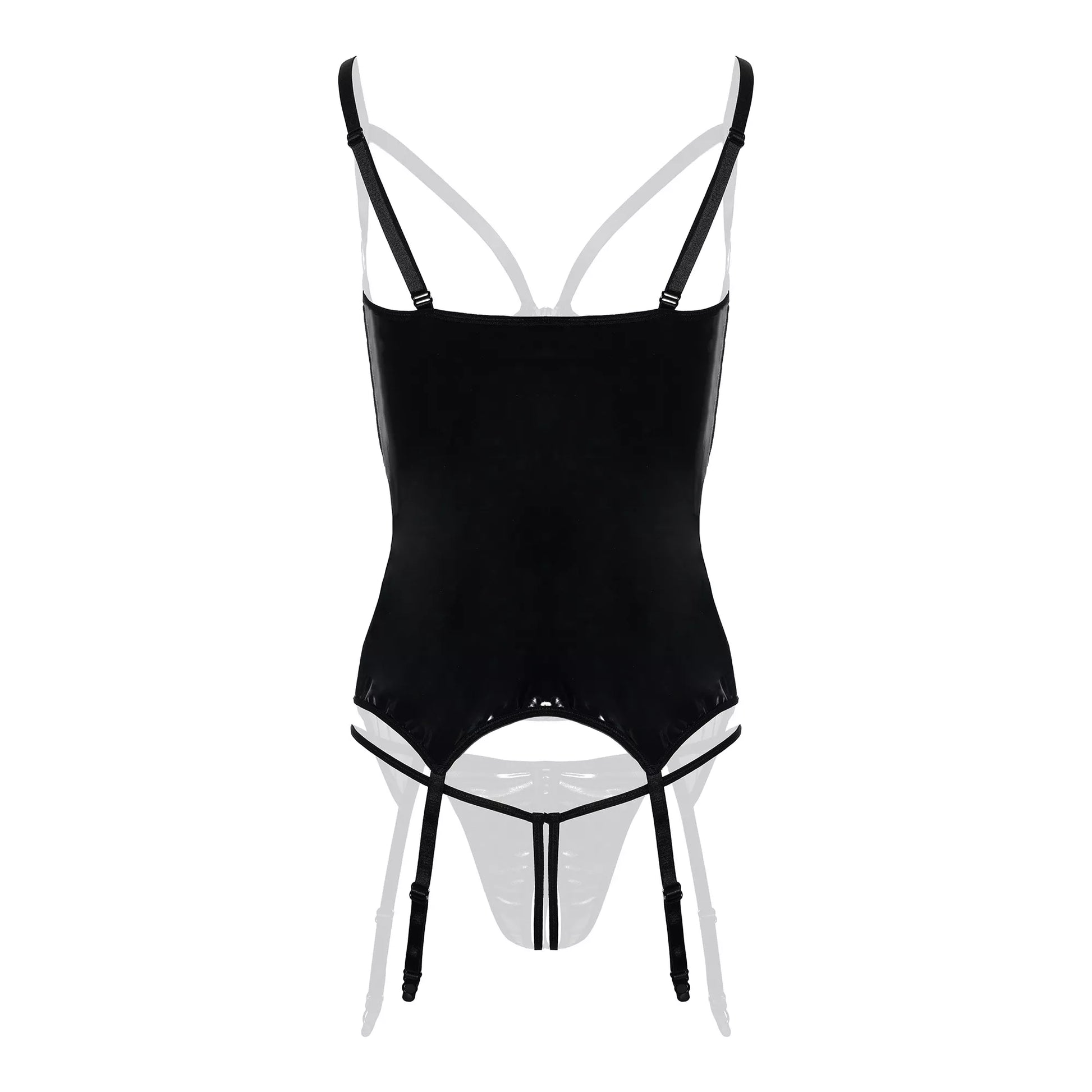 Cet ensemble noir mise sur une allure dominatrice et une finition brillante qui attire immédiatement le regard. Le corset à bonnets un quart prémoulés et ouverture frontale structure le buste, tandis que la matière extensible épouse le corps avec précision.