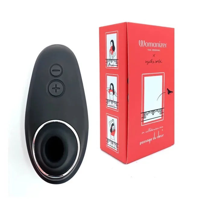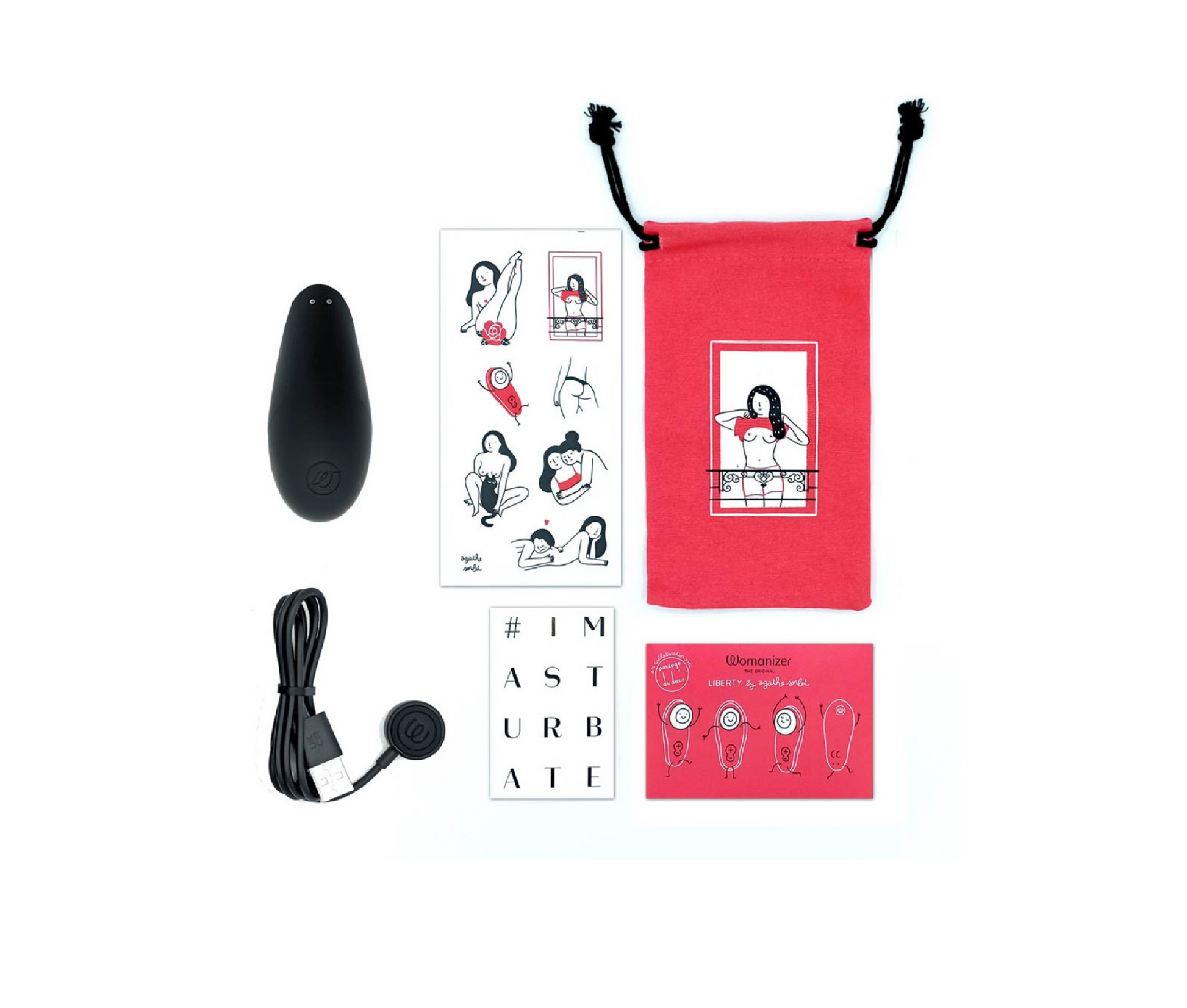 Le Womanizer Liberty by Agathe Sorlet est une édition exclusive imaginée en collaboration avec Passage du Désir. Il conserve la célèbre technologie sans contact qui a fait le succès de la marque, tout en adoptant un look totalement revisité : une élégante robe noire habillée d’illustrations tendres et sensuelles signées Agathe Sorlet.