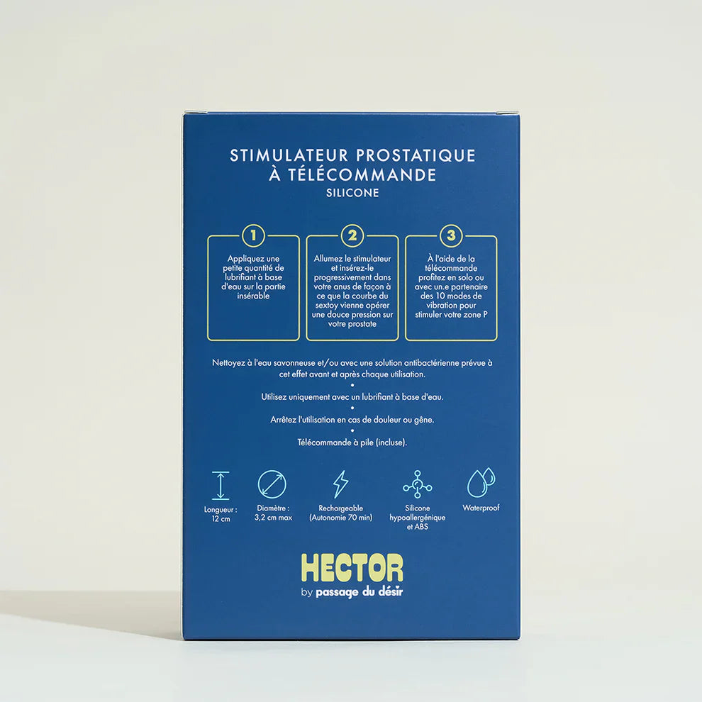 Le masseur prostatique télécommandé Hector transforme la stimulation anale en un jeu de sensations profondes et puissantes. Sa forme courbée cible la zone P avec précision, et son diamètre de 3,2 cm le rend parfaitement accessible aux débutant·es comme aux plus expérimenté·es.