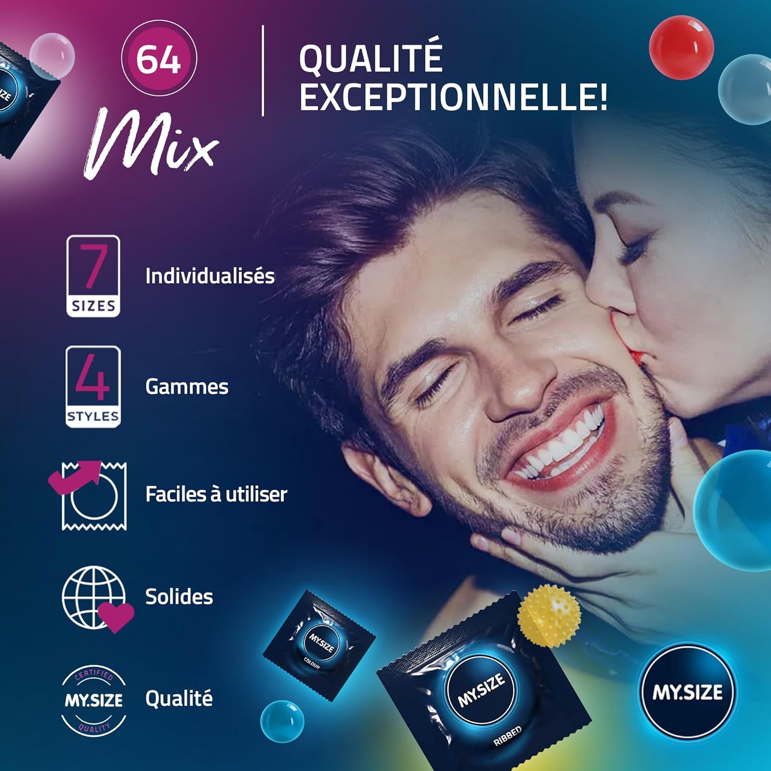 Le MY.SIZE Mix réunit 28 préservatifs en taille 64 mm pour explorer différentes sensations tout en profitant d’un ajustement précis. Entre versions aromatisées, colorées, nervurées et classiques, ce coffret est idéal pour varier les plaisirs selon l’envie du moment.