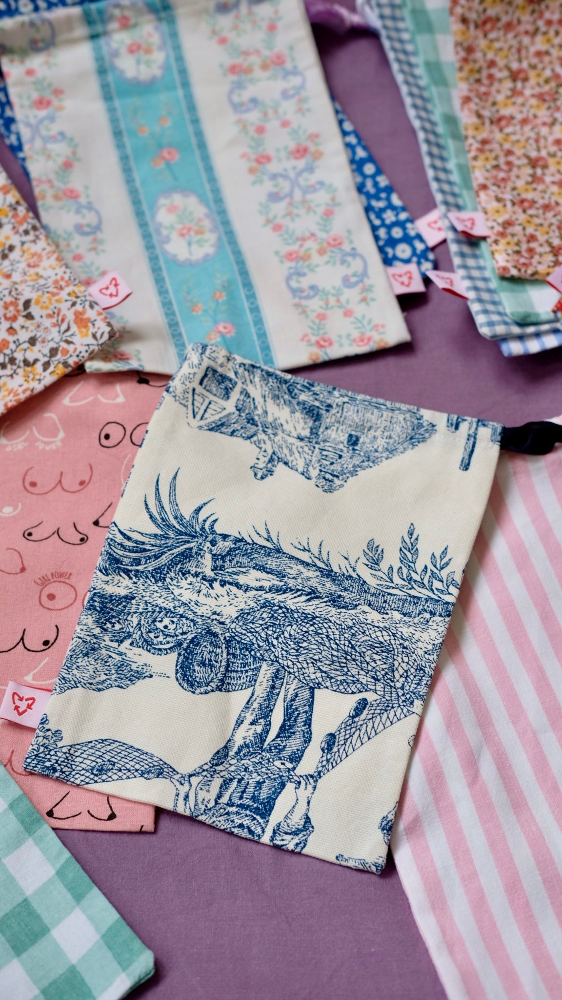 Chaque pochon est unique : la forme, la matière et le design dépendent de notre stock du moment. C’est la petite surprise Rejouis – utile, durable, et zéro déchet.
