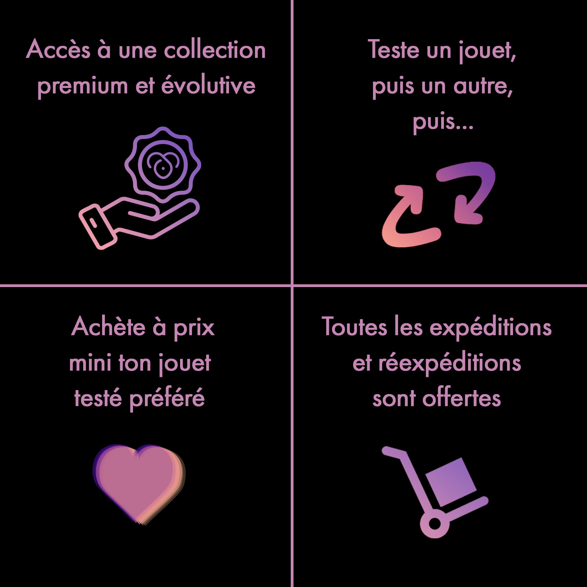 - Teste jusqu’à 4 sextoys premium sur 6 mois, sans engagement d’achat.